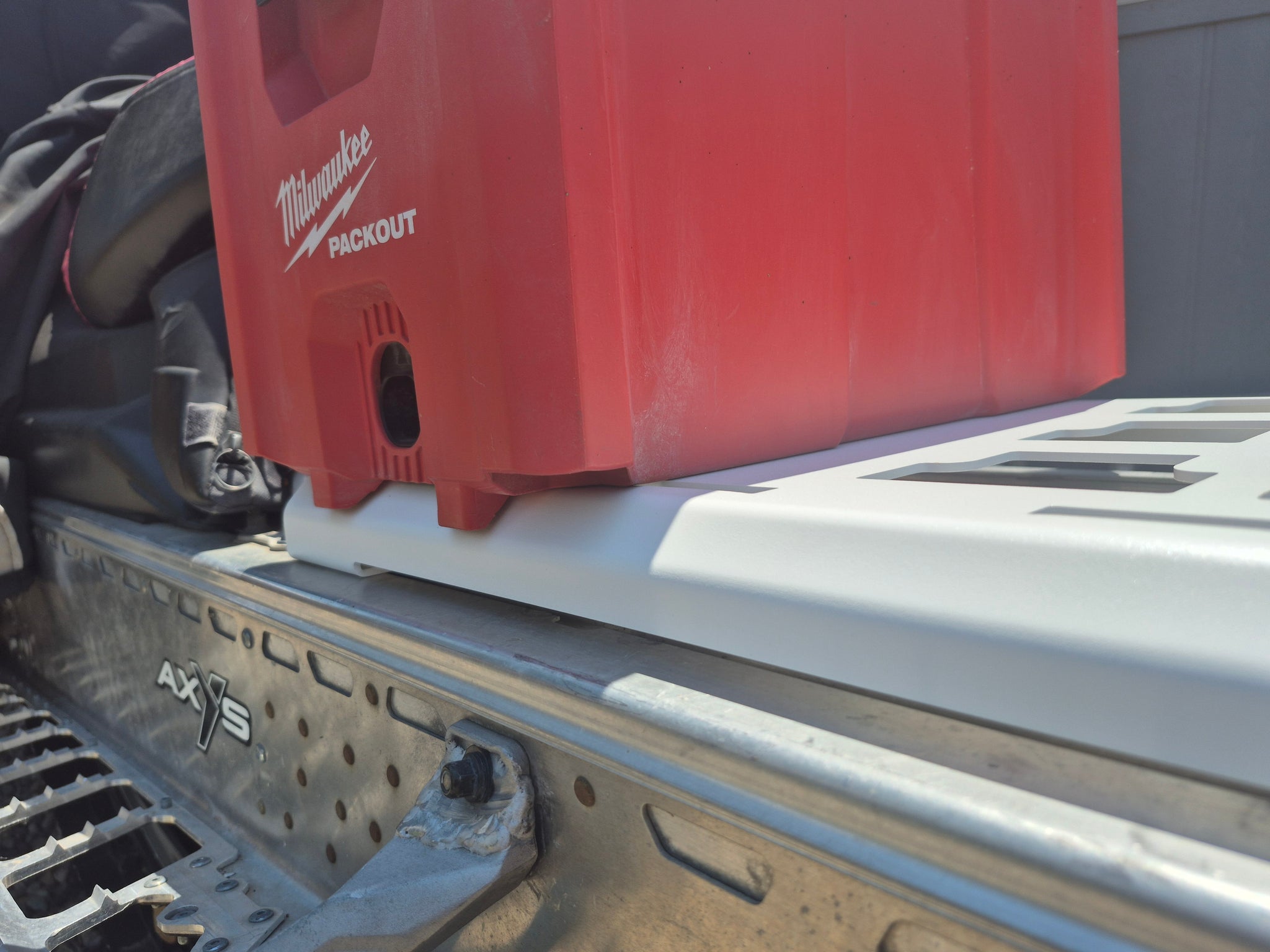 Made of 1/8" thick 5052 aluminum CNC cut and bent, optional powdercoat. The alternatives are often a lot thinner and wont hold the boxes as secure. Additional slots cut on sides for connecting bunge cords or webbing straps if you want to tie more cargo down on top. Boxes not included.